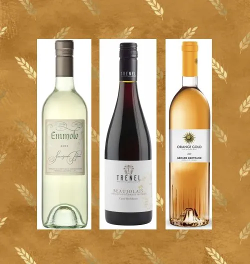 Cheeseboards are easy, simple, fun, and impressive. Cheese and wine bring out the best in each other. Create an epic cheese board with a variety of cheeses, preserves, and fresh fruits. Emmolo Sauvignon Blanc 2022 will pair perfectly with fresh cheeses like mozzarella, ricotta, and chèvre. Trenel Beaujolais Cuvee Rochebonne 2021 from France is a fun festive wine for Thanksgiving. It will be best complemented with comté, brie, or any other semi-soft cheese. If you want to wow your guests with a unique wine pairing, try Gérard Bertrand Orange Gold 2021, a wine that pairs with nearly every kind of cheese, no matter the texture or milk variety. Orange Gold is a French take on Georgian skin contact wines that has gorgeous floral notes and soft tannins.